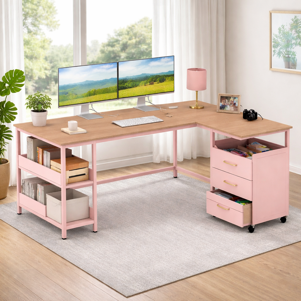 Bureau angle structure acier plateau bois tiroirs rangement roulettes support accessoires ordinateur travail